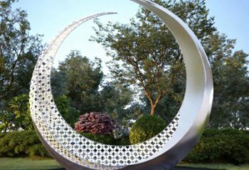 《月瀾織夢》是一件不銹鋼創(chuàng)意景觀雕塑:以鏤空鋼構織就新月形態(tài),搭配圓形水境,金屬肌理與水體相映,既借月的意象營造詩意氛圍,又以現代材質強化空間藝術感,是場地中兼具視覺張力與情感共鳴的公共藝術節(jié)點。